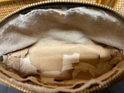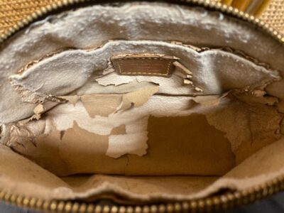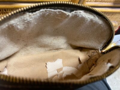 写真のようにバッグの内側がボロボロと剥がれてきてしまう現象ですね。このままでは全くバッグとして使い物になりませんので、そんな時は「内装交換修理」にて使えるバッグへ甦らせます。