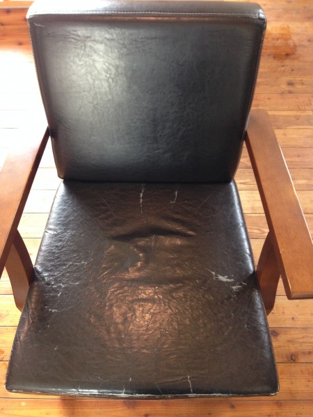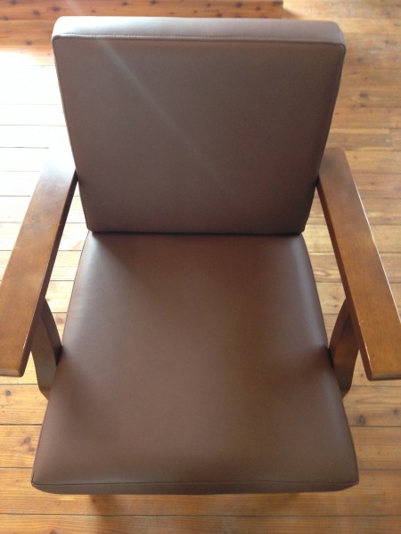 これは、座面と背もたれがスレ傷により塗膜剥げ等を起こしていましたが、革はまだまだ問題ありませんでしたので「染め直し」にて修理致しました。